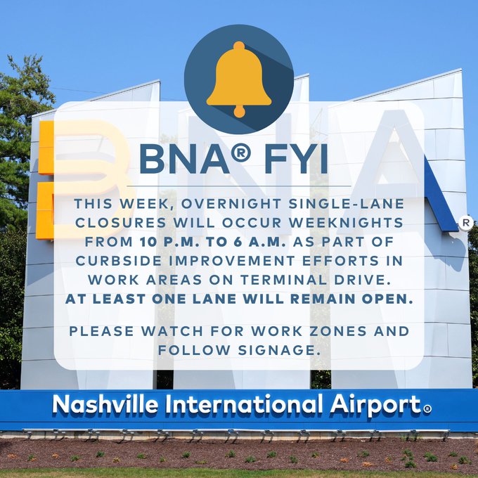 Nashville, Tennessee.-  El Aeropuerto Internacional de Nashville (BNA) informó que durante esta semana se realizarán cierres nocturnos de carriles como parte de un proyecto de mejoras viales en sus instalaciones. Las interrupciones están programadas desde finales de septiembre hasta principios de octubre.