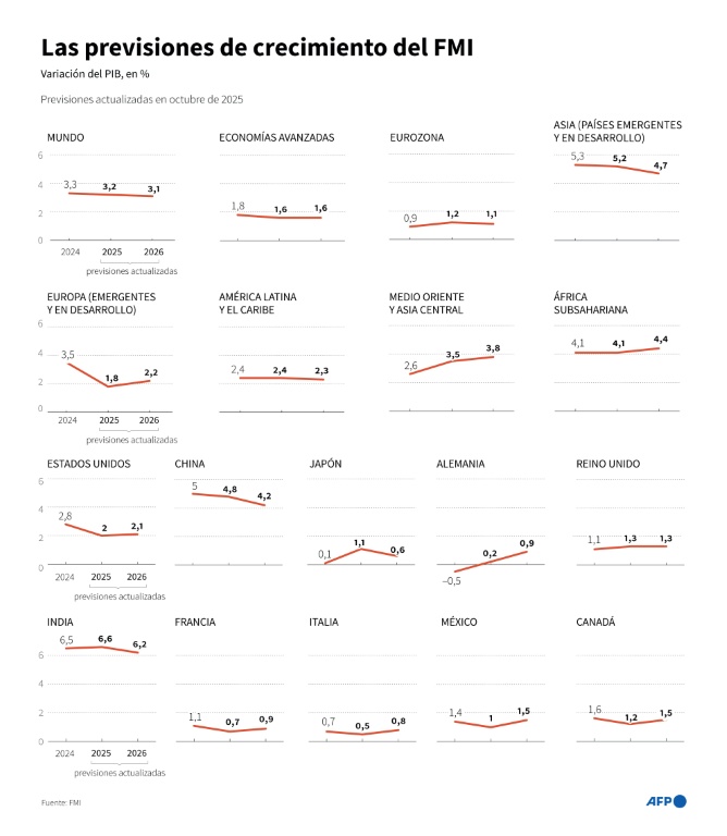 América Latina y el Caribe crecerán un 2,4% en 2025, sin cambios respecto al año pasado, una cifra «estable» a pesar de la amenaza de los aranceles estadounidenses, anunció este martes el Fondo Monetario Internacional (FMI).