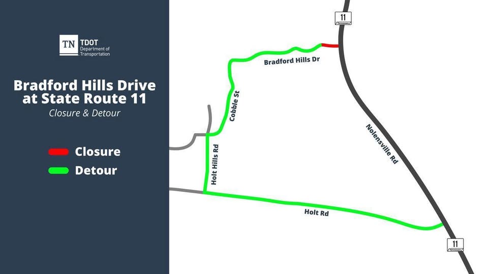 Nashville, Tennessee. El Departamento de Transporte de Tennessee (TDOT) anunció que Bradford Hills Drive, en el condado de Davidson, permanecerá cerrada a partir del lunes 1 de diciembre como parte del proyecto de ampliación de Nolensville Pike (SR 11/US 31A). La vía estará inhabilitada hasta abril de 2026, periodo durante el cual se habilitará un desvío para el tránsito que no pueda circular por la zona bloqueada.