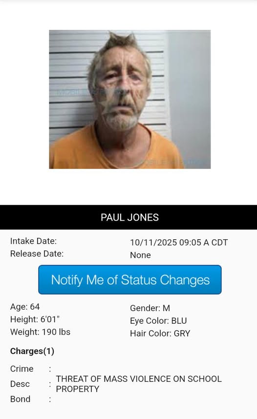 La detención se llevó a cabo el sábado 11 de octubre con el apoyo del Departamento del Sheriff del Condado de Decatur, luego de que un testigo considerado confiable alertara a las autoridades sobre una declaración preocupante atribuida a Jones. Según el reporte policial, el individuo habría dicho: “No sé qué tengo que hacer para que me tomen en serio, supongo que tendré que llevar un arma a la escuela primaria”.