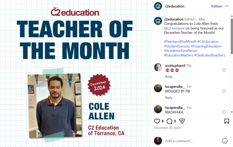 Allen también trabajó como profesor. Fue nombrado «Profesor del Mes» en diciembre de 2024 en C2 Education en Torrance, según una publicación de Instagram .