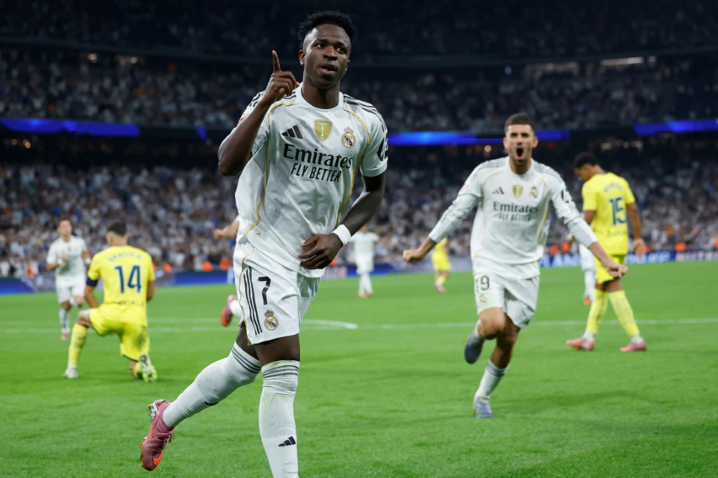El delantero brasileño del Real Madrid Vinicius celebra un gol ante el Villarreal, el 4 de octubre de 2025 en el estadio Santiago Bernabéu