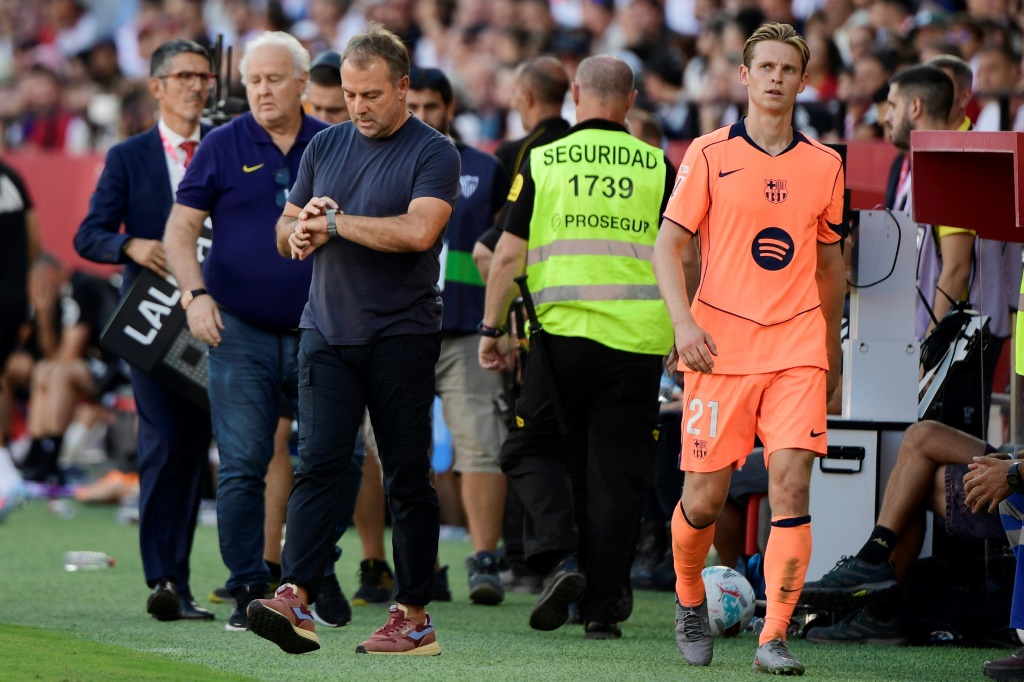 El entrenador del Barcelona Hans-Dieter Flick y el centrocampista Frenkie De Jong caminan en el partido ante el Sevilla, el 5 de octubre de 2025 en el estadio Ramón Sánchez-Pizjuán.