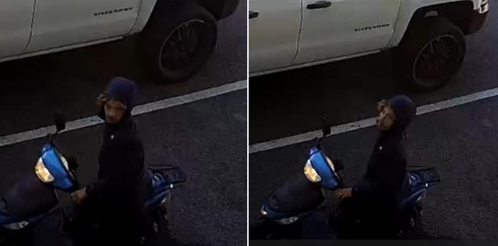El individuo, cuya imagen se muestra, llegó al lugar a bordo de un scooter azul y sustrajo la pistola de la víctima desde el interior de una camioneta blanca.
