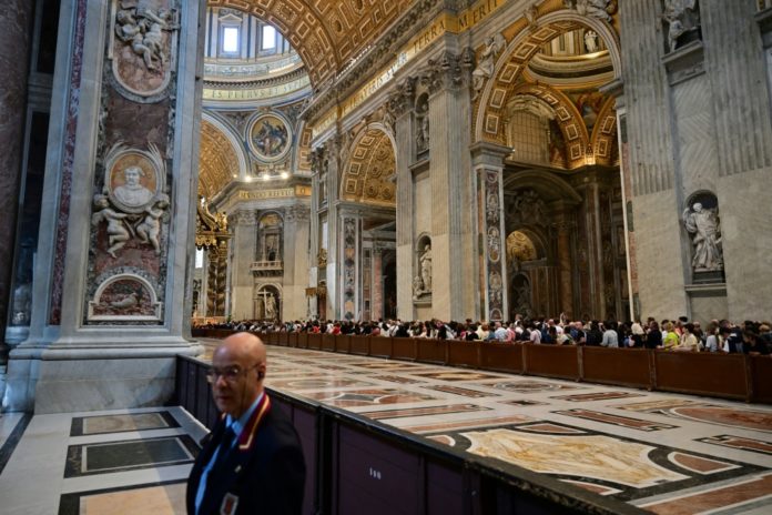 En el interior, un leve rumor, roto por el llanto de los niños, inunda la iglesia más grande del mundo. Una marea de fieles recorre su imponente nave central antes de llegar al féretro del santo padre de los católicos.
