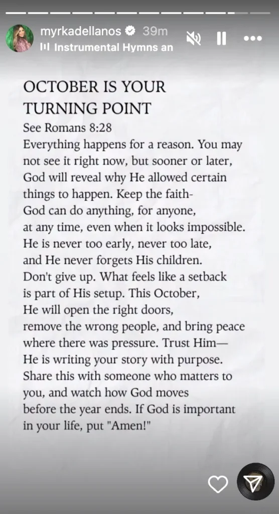 Hasta ahora, la periodista cubanoamericana no ha dado declaraciones al respecto. Sin embargo, en sus stories de Instagram colgó una imagen destacando el salmo de los romanos, versículo 8:28. «Todo pasa por una razón, puede que no lo veas ahora, pero tarde que temprano Dios te revelará porqué [pasó]», se lee en el mensaje que muchos han asociado con la noticia.