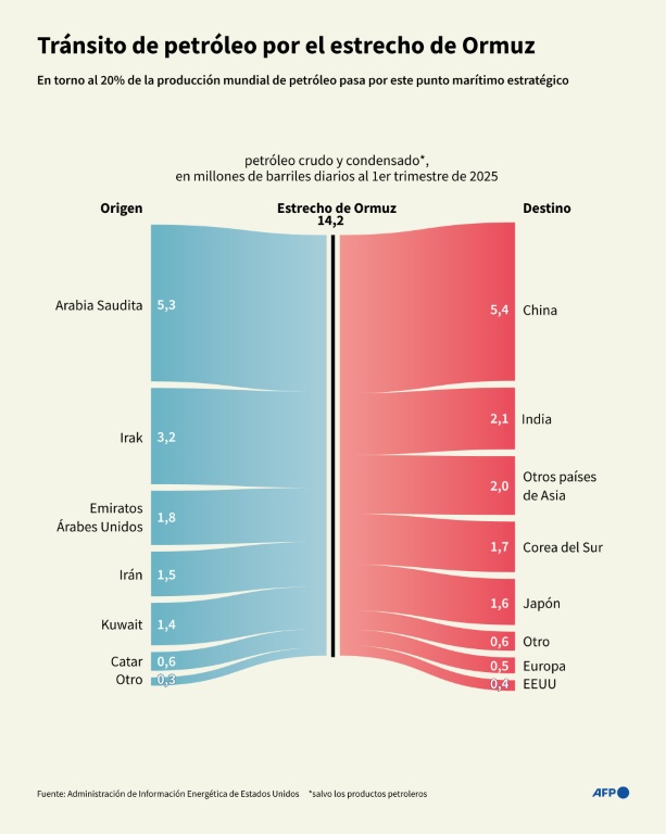 Cerca de 20 millones de barriles diarios (mb/d), es decir, aproximadamente el 20% del consumo mundial de petróleo, transitan normalmente por el estrecho de Ormuz, con destino principalmente a China, India, Corea del Sur y Japón.