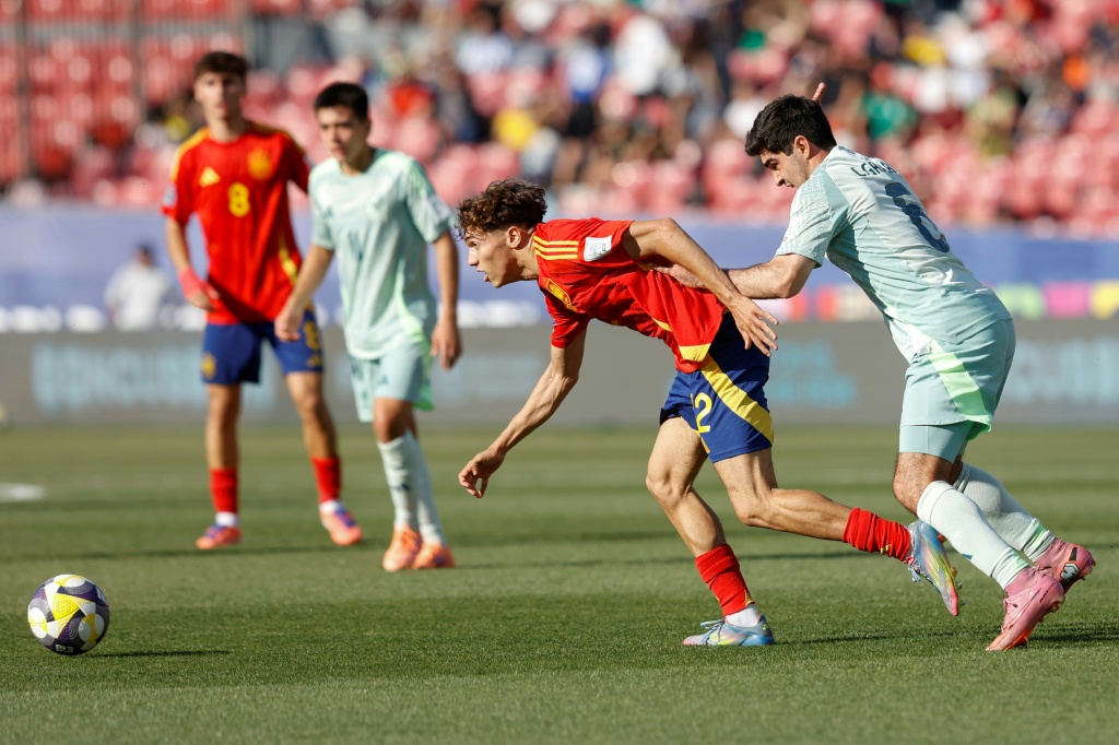 El centrocampista español Thiago Pitarch se va del mexicano César Garza durante el partido del Mundial sub-20 disputado el 1 de octubre de 2025 en Santiago de Chile
