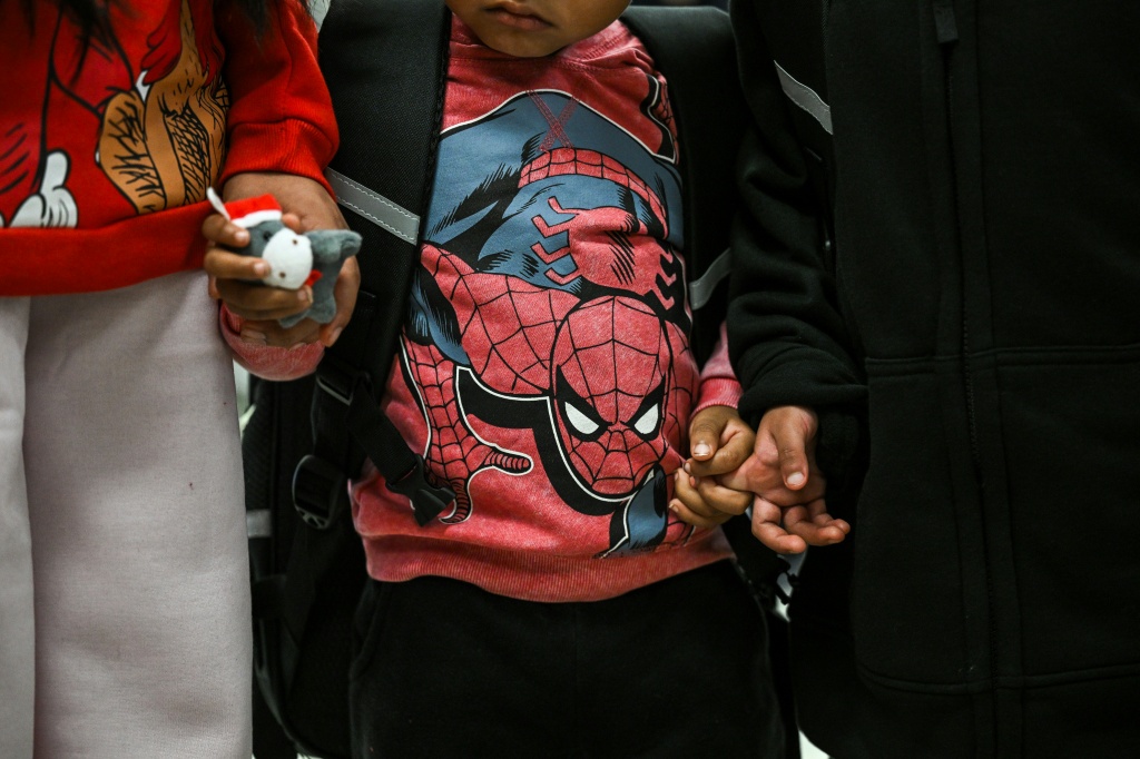 El más pequeño -sudadera de Spiderman y mochila de dinosaurios- mira alrededor con ojos tristes y soñolientos, y Gutiérrez lo toma en brazos para consolarlo.