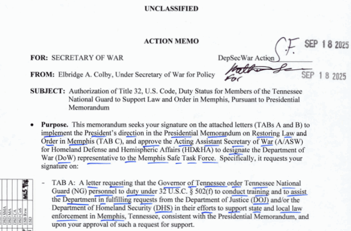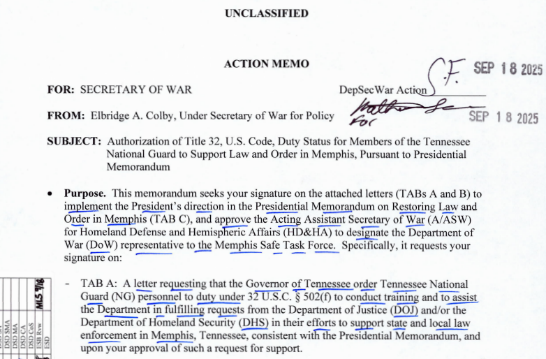 Un memorando del Departamento de Guerra, indica que el Secretario de Guerra, Pete Hegseth, está preparado para enviar hasta 1,000 efectivos de la Guardia Nacional de Tennessee hasta septiembre del próximo año. El plan propuesto en septiembre sugiere que las tropas participarían en operaciones de cumplimiento de la ley bajo la autoridad de las agencias locales que lo soliciten, dependiendo del número de efectivos y la duración.