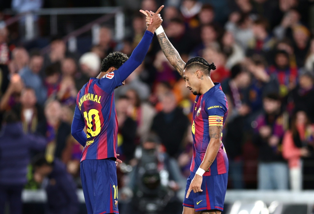 El delantero brasileño del Barcelona, Raphinha, celebra con el español Lamine Yamal, su primer gol durante el partido de LaLiga ante Osasuna en el estadio Camp Nou, el 13 de diciembre de 2025