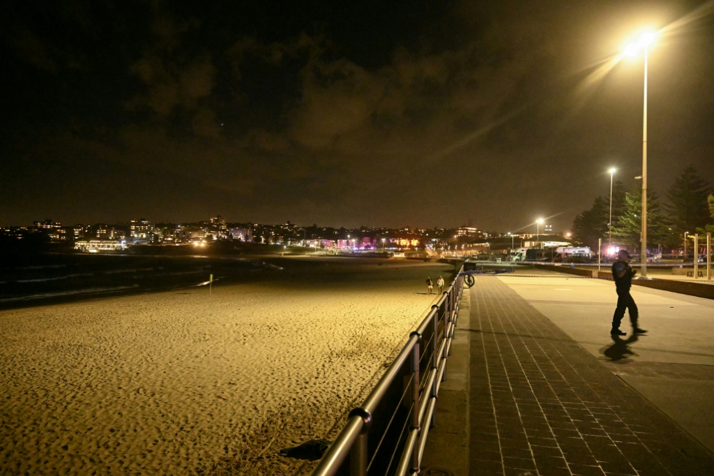 Un policía patrulla junto a Bondi Beach tras el tiroteo mortal en la famosa playa de Sídney, el 14 de diciembre de 2025 en la ciudad australiana