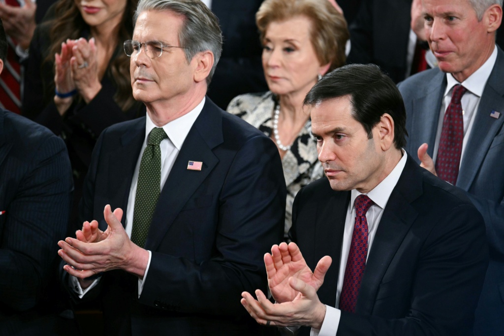 Scott Bessent, secretario del Tesoro, aplaude junto a Marco Rubio, secretario de Estado, durante el discurso sobre el estado de la Unión del presidente Donald Trump, el 24 de febrero de 2026 en el Congreso de EEUU, en Washington