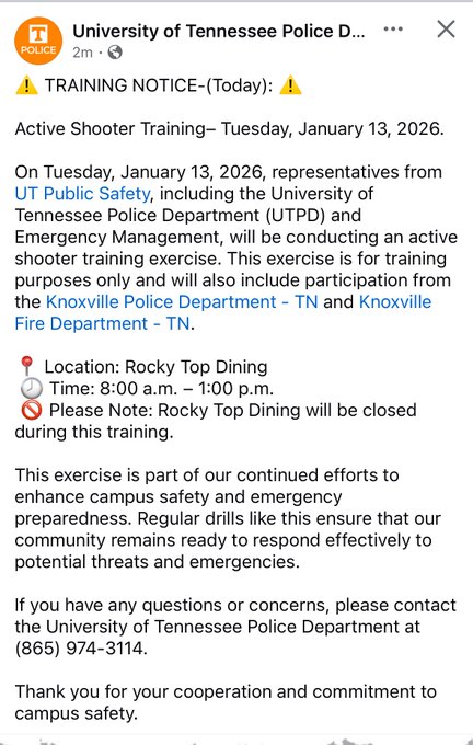 KNOXVILLE, TENNESSEE.- Autoridades informaron que este martes 13 de enero se lleva a cabo un ejercicio de entrenamiento por tirador activo en el campus de la Universidad de Tennessee, organizado por UT Public Safety, con la participación del Departamento de Policía de la Universidad de Tennessee (UTPD), Manejo de Emergencias, el Departamento de Policía de Knoxville y el Departamento de Bomberos de Knoxville.