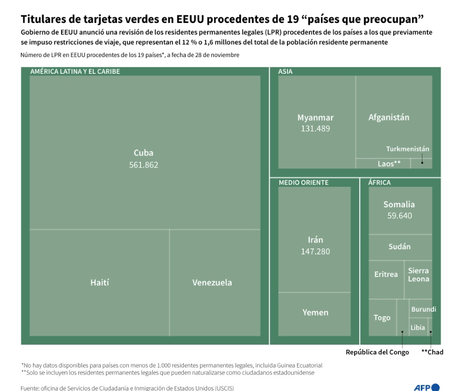 Más de 1,6 millones de titulares de Green Card, aproximadamente el 12 % de la población total de residentes permanentes en Estados Unidos, nacieron en los países mencionados, según datos oficiales.