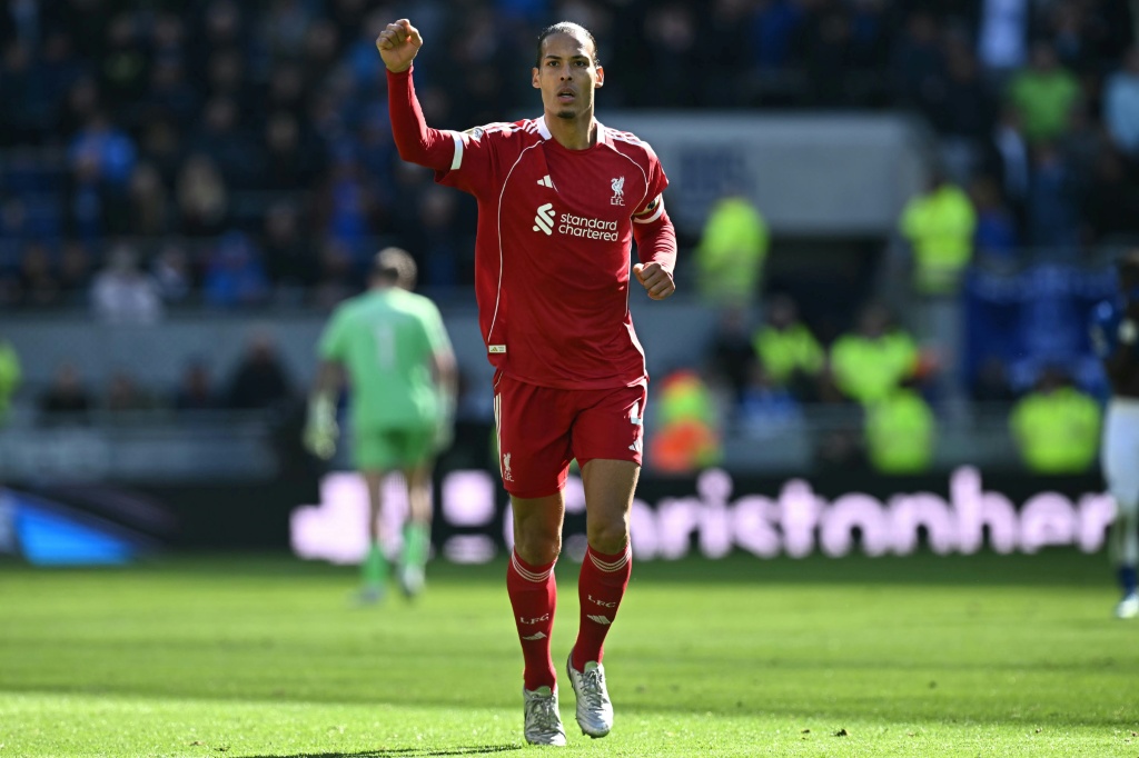 El central neerlandés del Liverpool, Virgil van Dijk, celebra su gol en el partido de la Premier League contra el Everton, en el Hill Dickinson Stadium de Liverpool, el 19 de abril de 2026