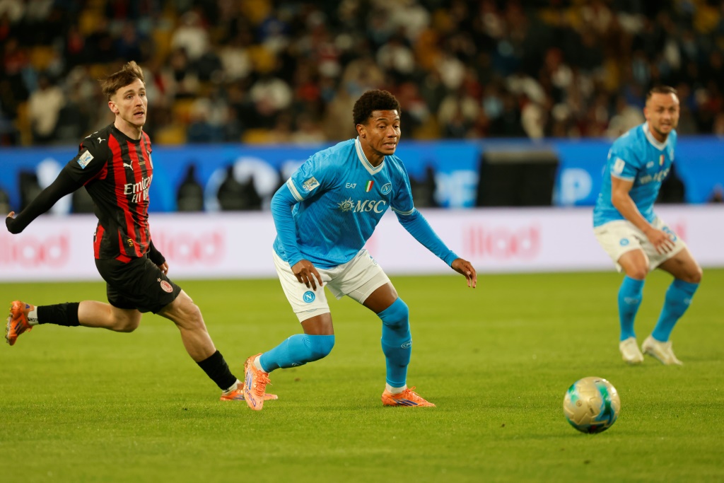 El campeón de la Serie A abrió el marcador por medio del brasileño David Neres (39′), que aprovechó un error del guardameta francés del Milan, Mike Maignan, sorprendido por un centro raso de Rasmus Hojlund.