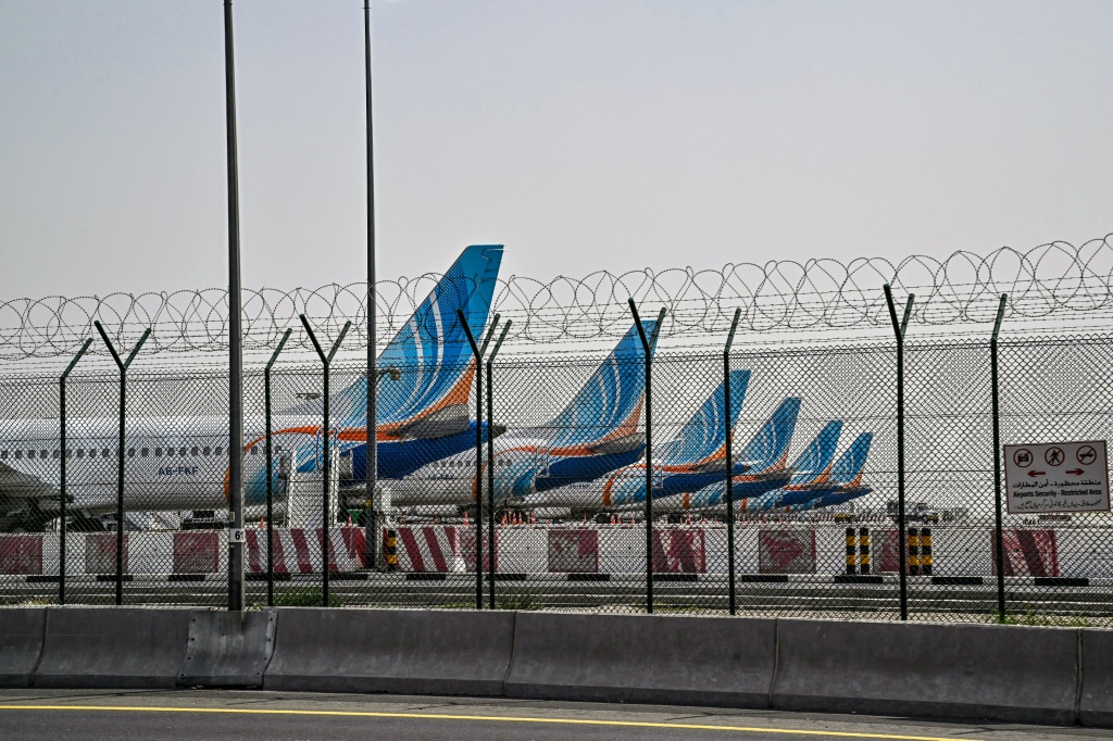 Aviones de la aerolínea FlyDubai permanecen estacionados en las pistas del aeropuerto de Dubaí como consecuencia de la situación creada por los ataques de EEUU e Israel a Irán y la respuesta de éste, el 2 de marzo de 2026 en el emirato del golfo Pérsico
