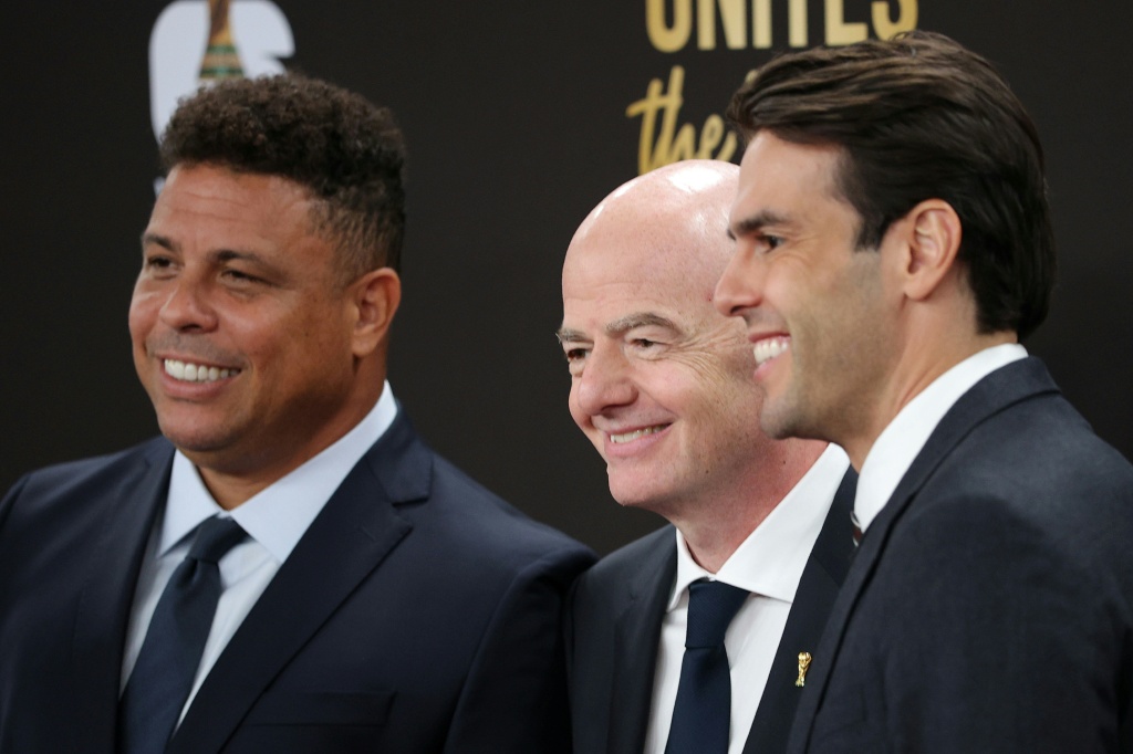 Gianni Infantino (centro) posa entre Ronaldo y Kaká en la alfombra roja del sorteo del Mundial de 2026 el 5 de diciembre de 2025