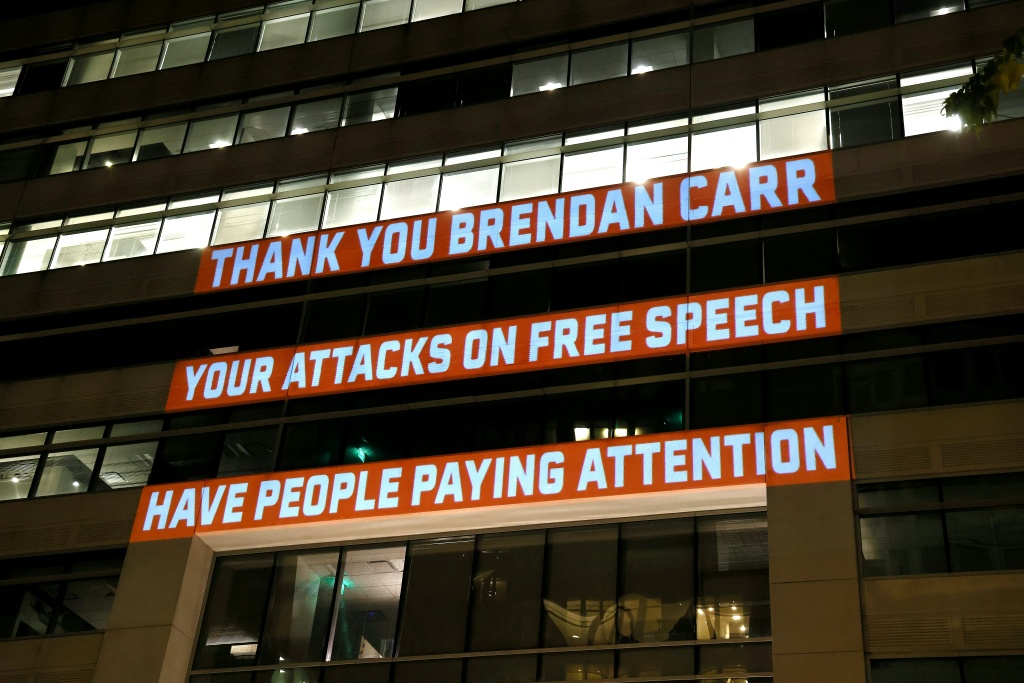 Una proyección en la sede de la FCC dice en inglés ‘Gracias, Brendan Carr, tus ataques a la libertad de expresión han hecho que la gente preste atención’, el 20 de octubre de 2025 en Washington