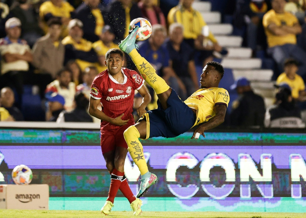 El lateral colombiano Cristian Borja, del América, despeja el balón en la final de ida del Clausura mexicano ante el Toluca el 22 de mayo de 2025 en la Ciudad de México