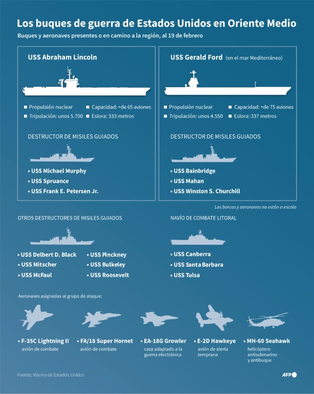 Infografía explicativa con los buques de guerra de Estados Unidos desplegados en Oriente Medio, entre ellos el USS Abraham Lincoln y el USS Gerald Ford, según la información transmitida por la Marina de EEUU