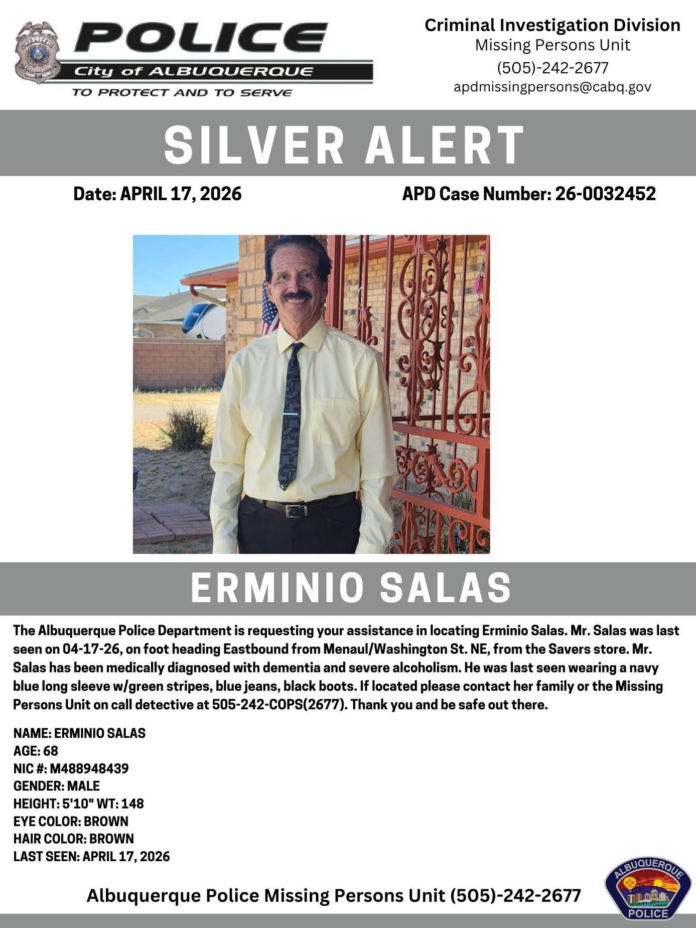 Albuquerque, Nuevo México.- El Departamento de Policía de Albuquerque (APD) ha emitido una Alerta Silver solicitando el apoyo urgente de la comunidad para dar con el paradero de Erminio Salas.