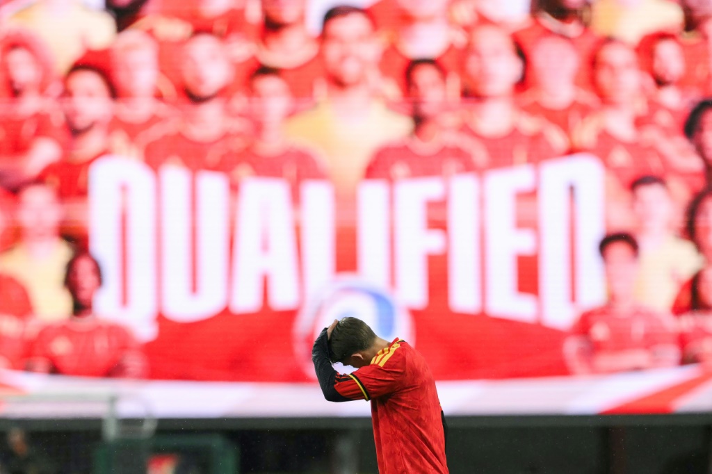 Un jugador belga pasa por delante de una pantalla con el mensaje «Qualified» (clasificada) tras la victoria 7-0 contra Liechtenstein, el 18 de noviembre de 2025 en Lieja, Bélgica