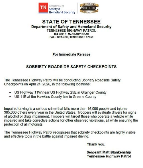 TENNESSEE.- El Departamento de Seguridad y Seguridad Nacional de Tennessee informó que la Patrulla de Carreteras llevará a cabo controles de sobriedad el 24 de abril de 2026 en distintos puntos del estado, incluyendo la US Highway 11W cerca de la US Highway 25E en el condado de Grainger, y la US 11E en la línea del condado de Hawkins, en Greene County.