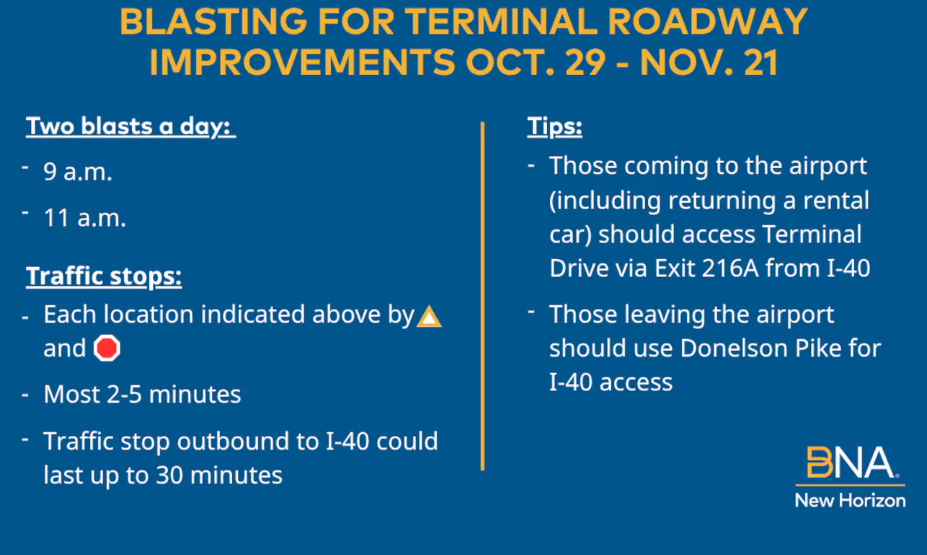 Nashville, Tennessee.– El Aeropuerto Internacional de Nashville (BNA) realizará voladuras controladas hasta el 21 de noviembre como parte de su expansión. Se esperan cortes breves en la I-40 y Terminal Drive cada mañana entre semana.
