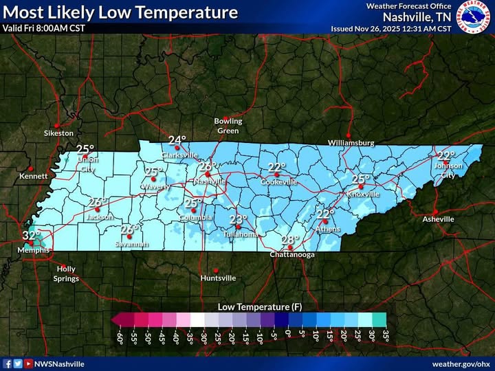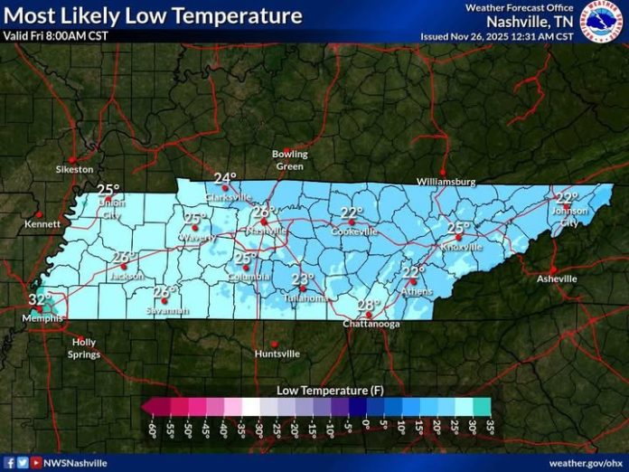 Nashville, Tn.- Un frente frío avanza por todo el estado y promete convertir el feriado de Acción de Gracias en una celebración marcada por el frío intenso. Según las previsiones oficiales, gran parte de Tennessee experimentará temperaturas especialmente bajas durante la madrugada del viernes, justo cuando muchos salgan a aprovechar las ofertas del tradicional Black Friday.