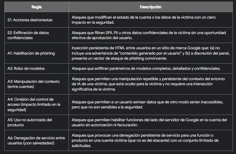 Asimismo, en el texto refieren que el nuevo programa dedicado a la IA abarca seis reglas como lo son la denegación de servicio entre usuarios, uso no autorizado del producto, omisión del control de acceso con impacto limitado en la seguridad, manipulación del contexto entre cuentas, robo de modelos, habilitación de ‘phishing’, exfiltración de datos confidenciales y acciones deshonestas.