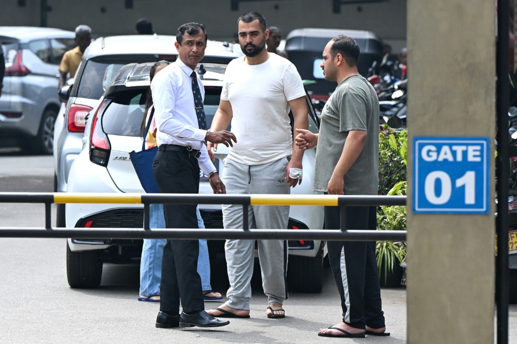 Unos marinos iraníes del barco de guerra hundido por un submarino estadounidense dialogan con un responsable del hospital Karapitiya (izq.) de Galle, en Sri Lanka, donde reciben tratamiento los heridos, el 5 de marzo de 2026