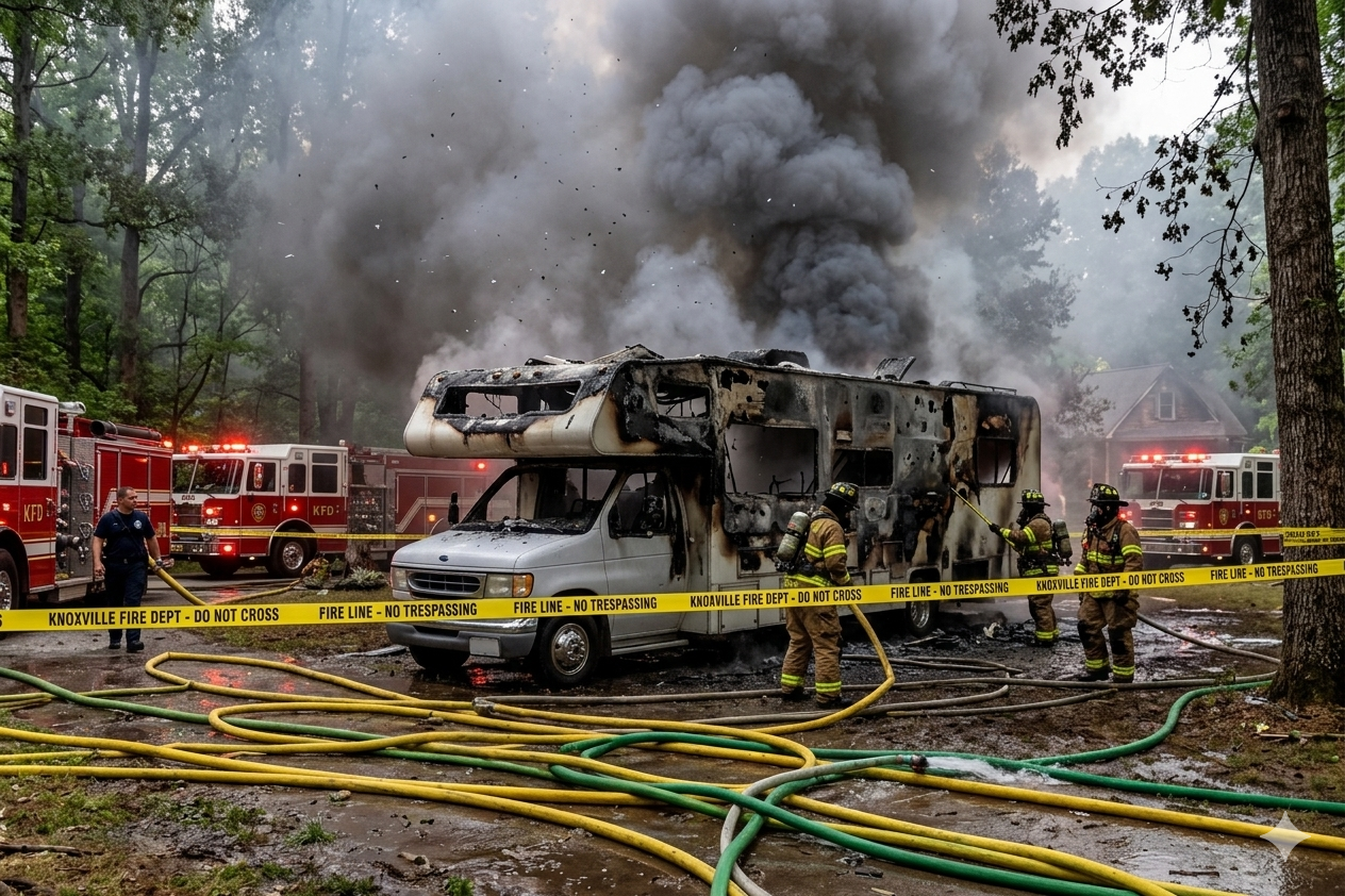 Knoxville, Tennessee — Una mañana de sábado que transcurría con normalidad se vio interrumpida por un siniestro en el sector de East Knoxville, donde una casa rodante (RV) resultó en pérdida total tras ser devorada por las llamas. El incidente movilizó rápidamente a los cuerpos de auxilio locales para evitar una tragedia mayor en la zona residencial.