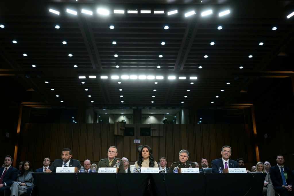 La directora de Inteligencia Nacional de EEUU, Tulsi Gabbard (centro), habla junto a varios jefes de organismo de seguridad estadounidenses durante su comparecencia en un comité del Senado de EEUU, el 18 de marzo de 2026 en Washington