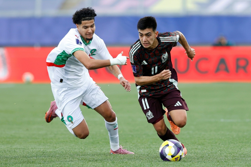 El delantero de Marruecos, Ilias Boumassaoudi, y el mediocampista de México, Gilberto Mora, luchan por el balón durante el partido de fútbol de la Copa Mundial Sub-20 de la FIFA 2025 entre México y Marruecos en el Estadio Elías Figueroa en Valparaíso, Chile, el 4 de octubre de 2025.