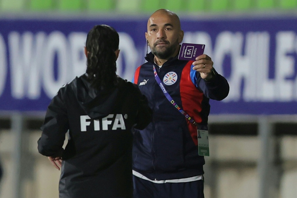 Un miembro del cuerpo técnico de Paraguay entrega la nueva tarjeta de Video Asistencia (VS) para solicitar la revisión de una jugada durante el partido de fútbol de la Copa Mundial Sub-20 de la FIFA 2025 entre Corea del Sur y Paraguay en el Estadio Elías Figueroa en Valparaíso, Chile el 30 de septiembre de 2025.