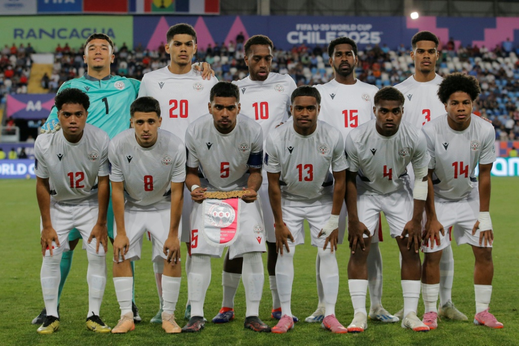 Los jugadores de Nueva Caledonia posan para una foto de equipo antes del partido de la Copa Mundial Sub-20 de la FIFA 2025 contra Sudáfrica en el Estadio El Teniente en Rancagua, Chile, el 2 de octubre de 2025.