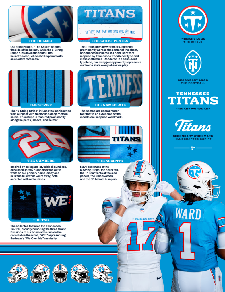 El nuevo logotipo principal del equipo, «El Escudo» (The Shield), se mantiene fiel a la identidad de los Titans, presentando los intensos colores característicos del equipo —azul Titans, blanco y rojo—, así como sus familiares tres estrellas. Un emblema secundario, «El Balón» (The Football), constituye un guiño cultural a la ciudad y al estado, ofreciendo a los aficionados una forma novedosa de demostrar su orgullo por los Titans. Las letras «T» y «N» se fusionan en una disposición vertical que conmemora tanto la abreviatura postal del estado como la ciudad de Nashville, TN. Una variedad de otros emblemas, incluida una marca denominativa con tipografía manuscrita de diseño artesanal, adornan también el nuevo conjunto de logotipos del equipo.