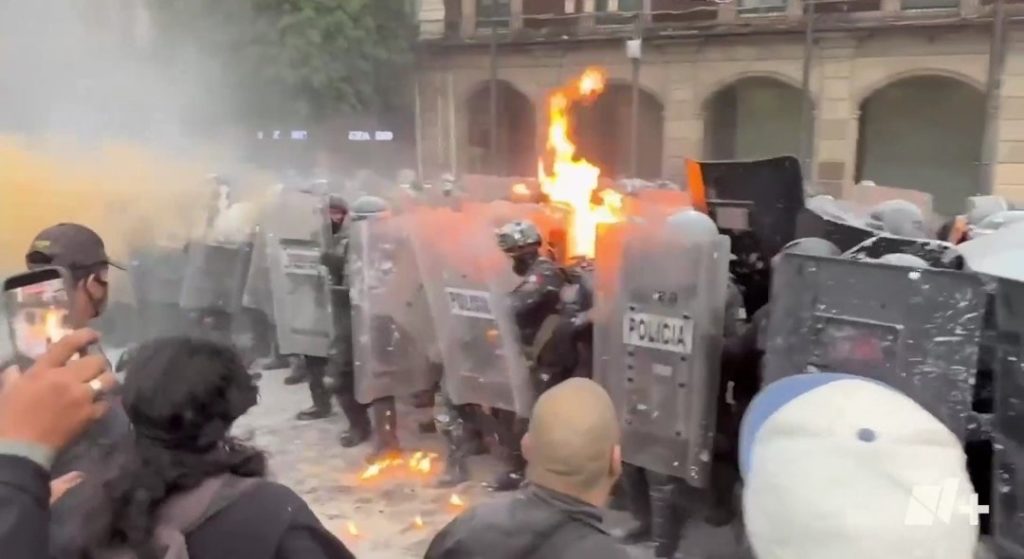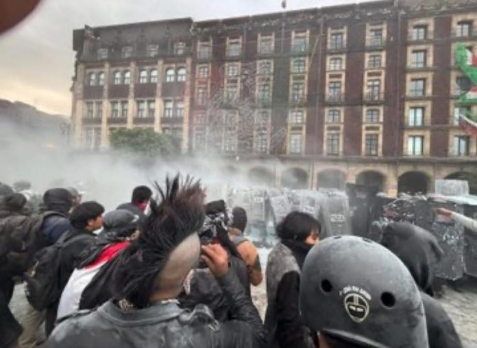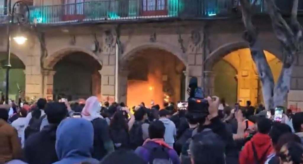 Se reportaron pintas, flamazos y lanzamiento de piedras contra la policía. La tensión se elevó en el Zócalo, donde los encapuchados vandalizaron la puerta del Centro Joyero.