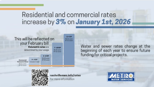 Nashville, TN. – Metro Water Services (MWS) informó que a partir del 1 de enero de 2026 entrará en vigor un nuevo incremento en las tarifas de agua y alcantarillado. El ajuste será del 3% tanto para clientes residenciales como comerciales, y comenzará a reflejarse en las facturas de febrero.
