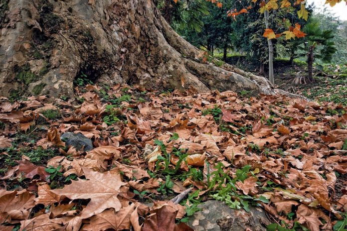 En las imágenes se observa que la mujer dibujó una carita feliz y un corazón con las hojas secas y la frase “Buen día” acompañada por una flor también formada con las hojas secas.