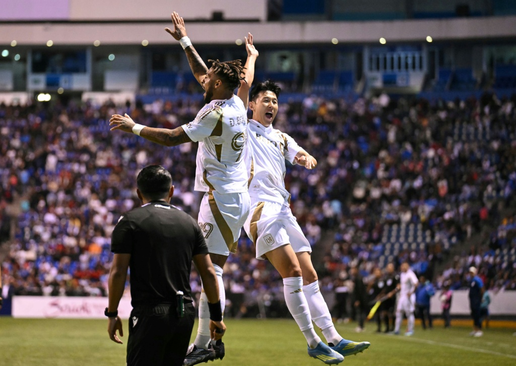 El delantero gabonés Denis Bouanga (izq.) y el atacante surcoreano Son Heung-Min, de Los Angeles FC, celebran tras avanzar a semifinales de la Copa de Campeones de la Concacaf en el estadio Cuauhtémoc en Puebla, México, el 14 de abril de 2026