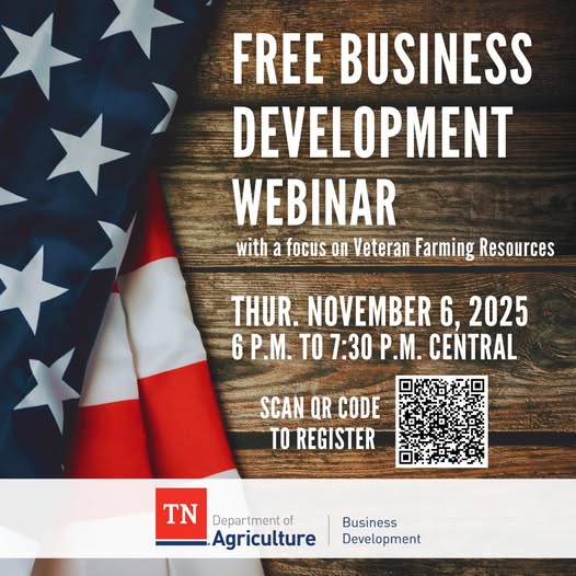 Para complementar el lanzamiento, la División de Desarrollo Empresarial del Departamento de Agricultura de Tennessee (TDA) ofrecerá un seminario web gratuito para veteranos y miembros del servicio militar el 6 de noviembre de 6:00 p. m. a 7:30 p. m. (hora central).