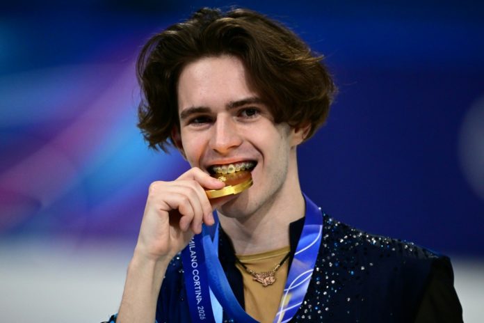Mijail Shaidorov muerde su medalla de oro olímpica en la prueba individual del patinaje artístico de los Juegos de Invierno de Milán-Cortina. En Milán (norte de Italia), el 13 de febrero de 2026. AFP
