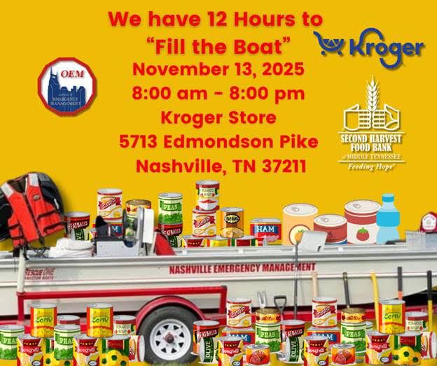 NASHVILLE, TN. – Este jueves 13 de noviembre, el Departamento de Manejo de Emergencias de Nashville (OEM), junto con Kroger y el Banco de Alimentos Second Harvest, llevará a cabo una jornada especial para recolectar alimentos destinados a familias que enfrentan inseguridad alimentaria.