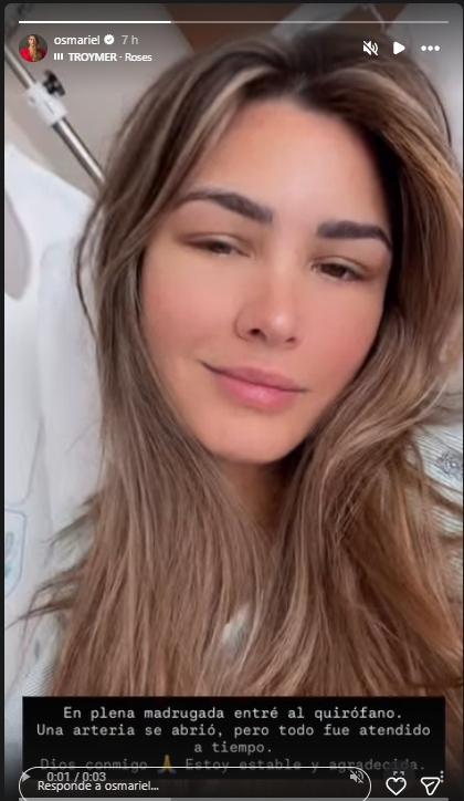 En sus historias de Instagram, la presentadora de Tv explicó que  “una arteria se abrió” y tuvo que acudir de inmediato a un centro de salud, donde fue intervenida quirúrgicamente «a tiempo».