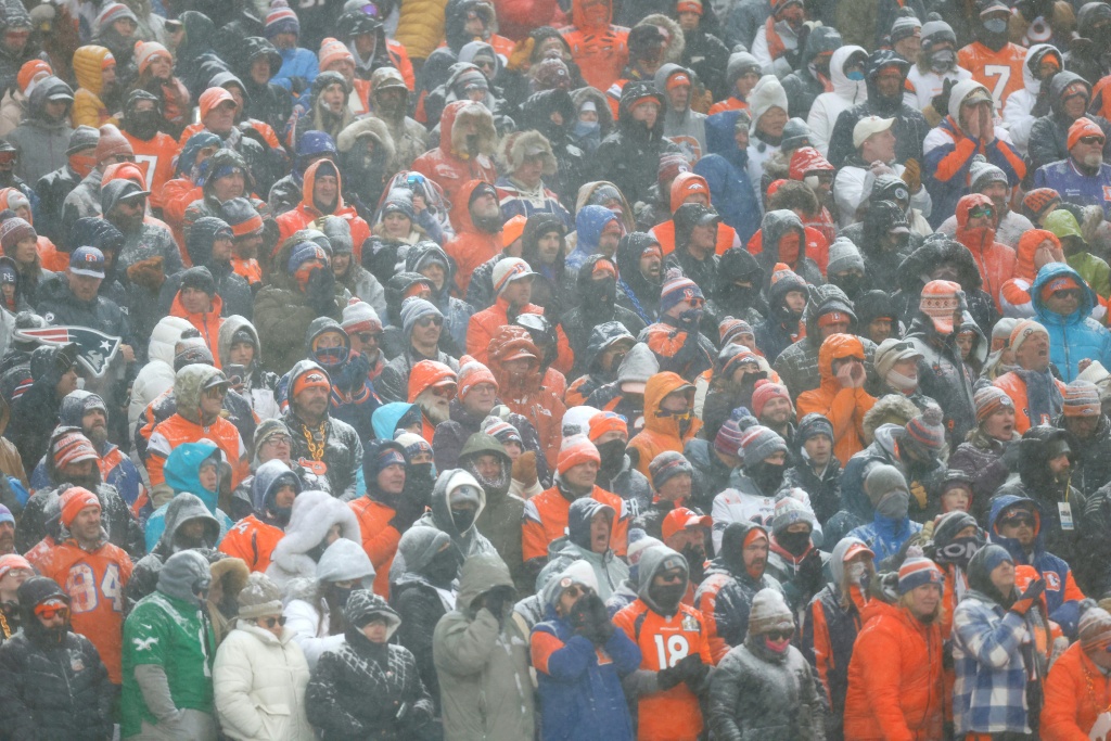 Aficionados de los Denver Broncos siguen bajo la nieve el partido ante los New England Patriots el 25 de enero de 2026