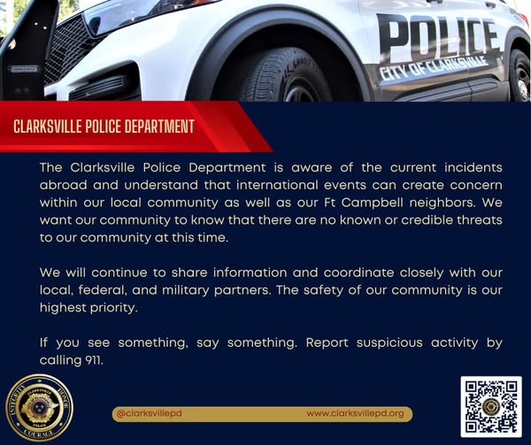 CLARKSVILLE, TENNESSEE.- El Departamento de Policía de Clarksville informó que está al tanto de los incidentes recientes ocurridos en el extranjero y reconoce que los acontecimientos internacionales pueden generar inquietud tanto en la comunidad local como en los residentes cercanos a Fort Campbell.