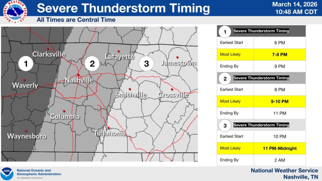 Por último, se ha emitido un Aviso de Vientos para toda la región de Middle Tennessee, vigente para la tarde y la noche de mañana. Serán habituales los vientos procedentes del sur con velocidades de entre 15 y 25 mph, con la posibilidad de rachas que alcancen las 40 mph. (Estos vientos son independientes de las tormentas eléctricas; los vientos asociados directamente a las tormentas podrían ser mucho más intensos, llegando a tener la fuerza de un tornado de baja intensidad). Por favor, recuerden —es sumamente importante— contar con múltiples medios para recibir las alertas y avisos, asegurándose de que estos sean lo suficientemente efectivos como para despertarlos.
